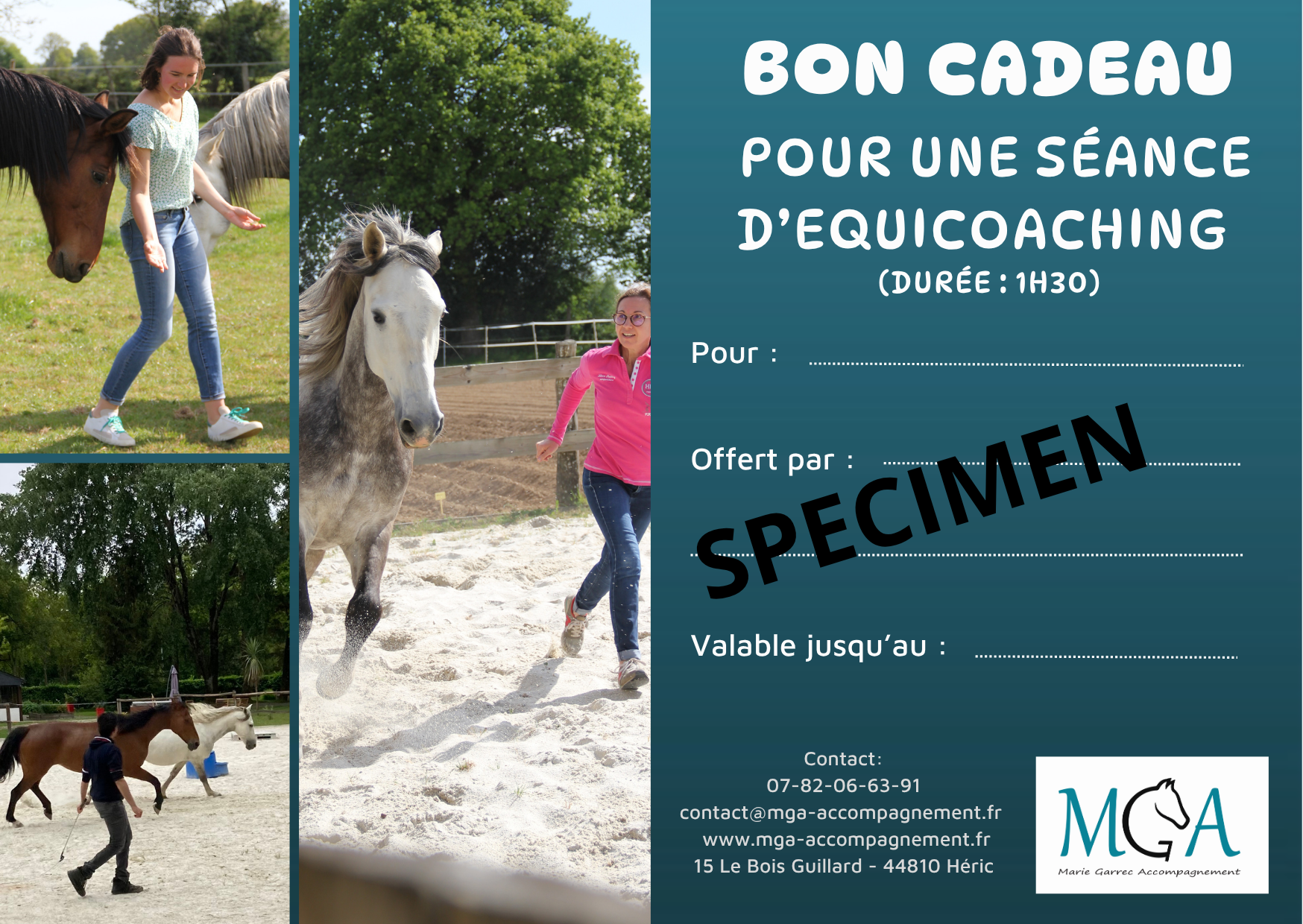 – Découverte de l’accompagnement avec les chevaux; Marche Afghane (méditative) avec les chevaux; Ressourcement avec les chevaux ; Sophrologie & cheval; Connaissance de soi assistée par le cheval; Confiance en soi aidée par le cheval; etc